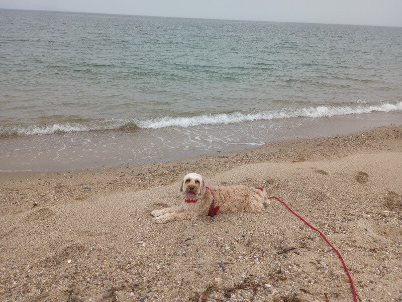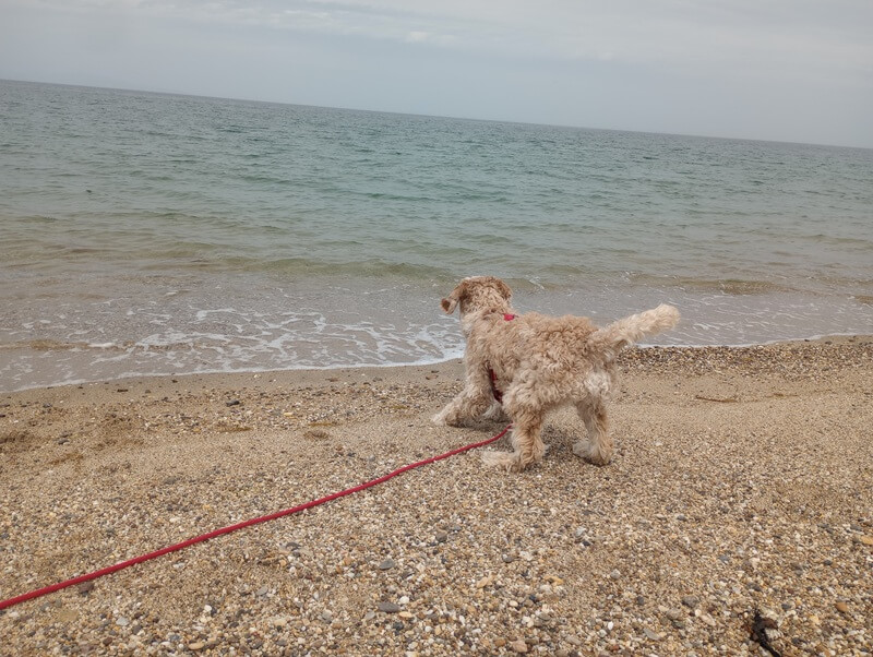 砂浜は人が少なく、散歩しやすかったです。最初は波打ち際でうろたえてましたが、その後飛び込んでいくこともなく、海が気にもならない様子。