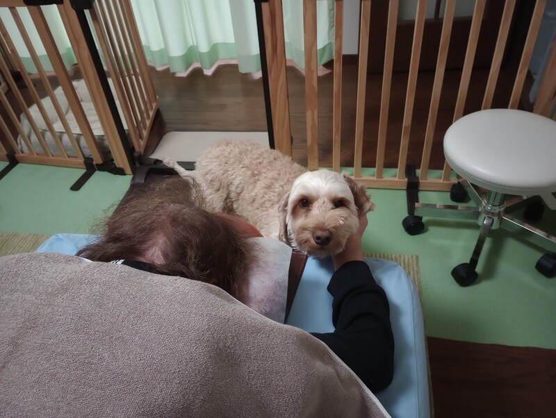 ということで、現在は、施術中に犬がすぐそばにいる、ということもできます。あなたの手にあごを乗せたり、飽きたら横で寝転がっています。